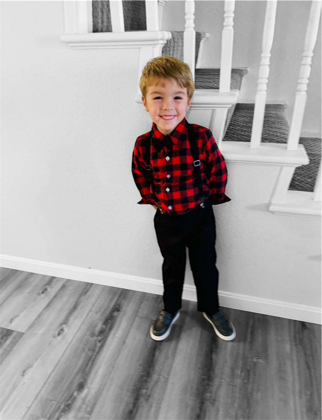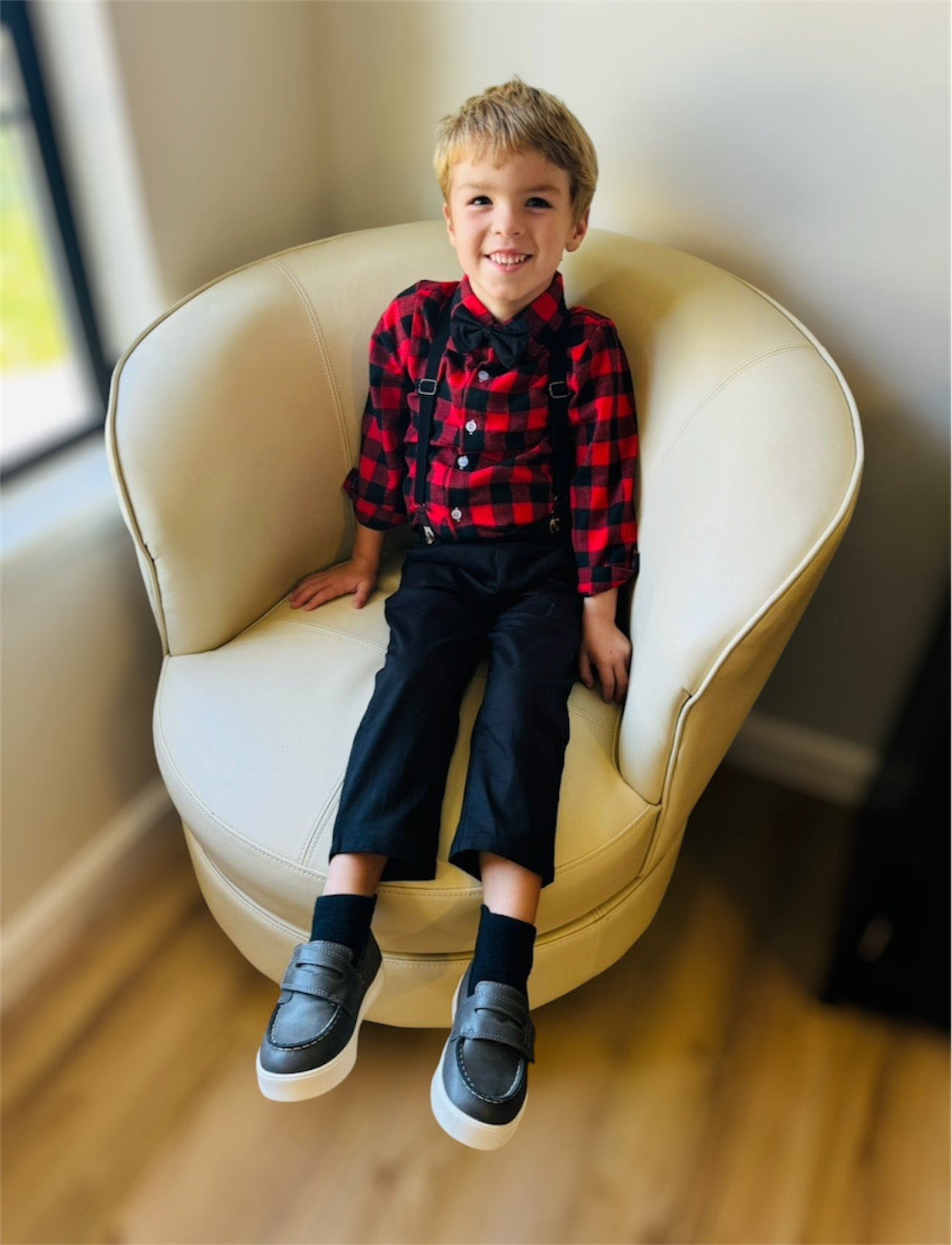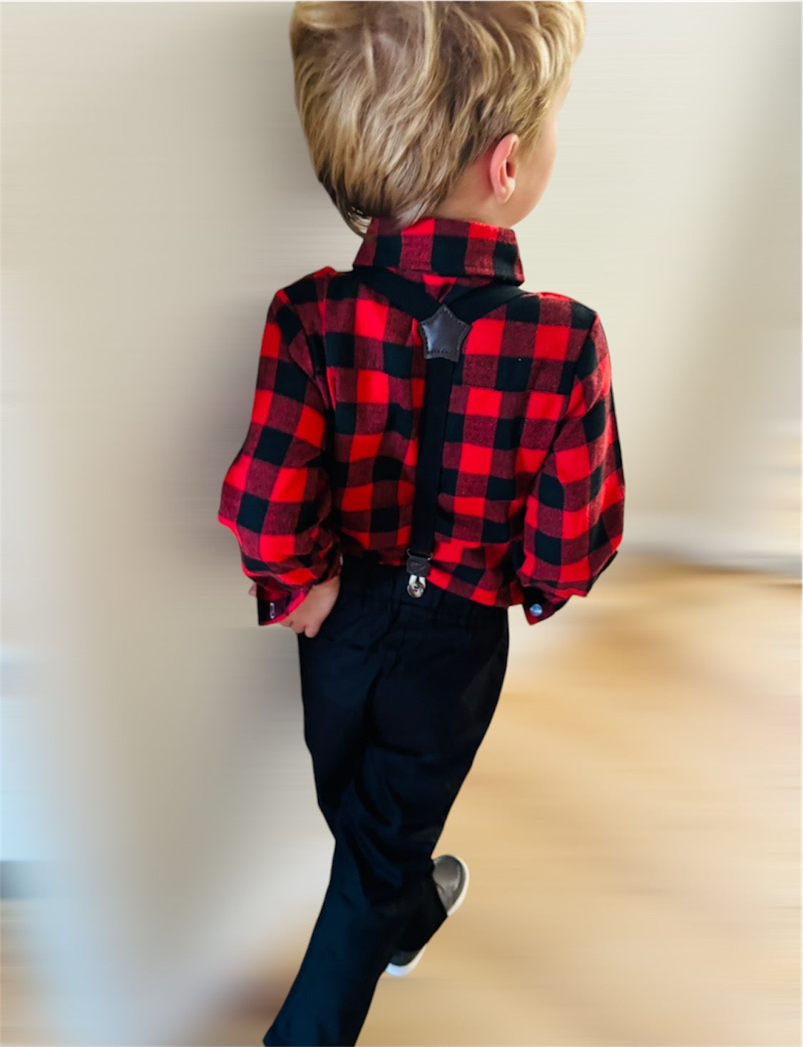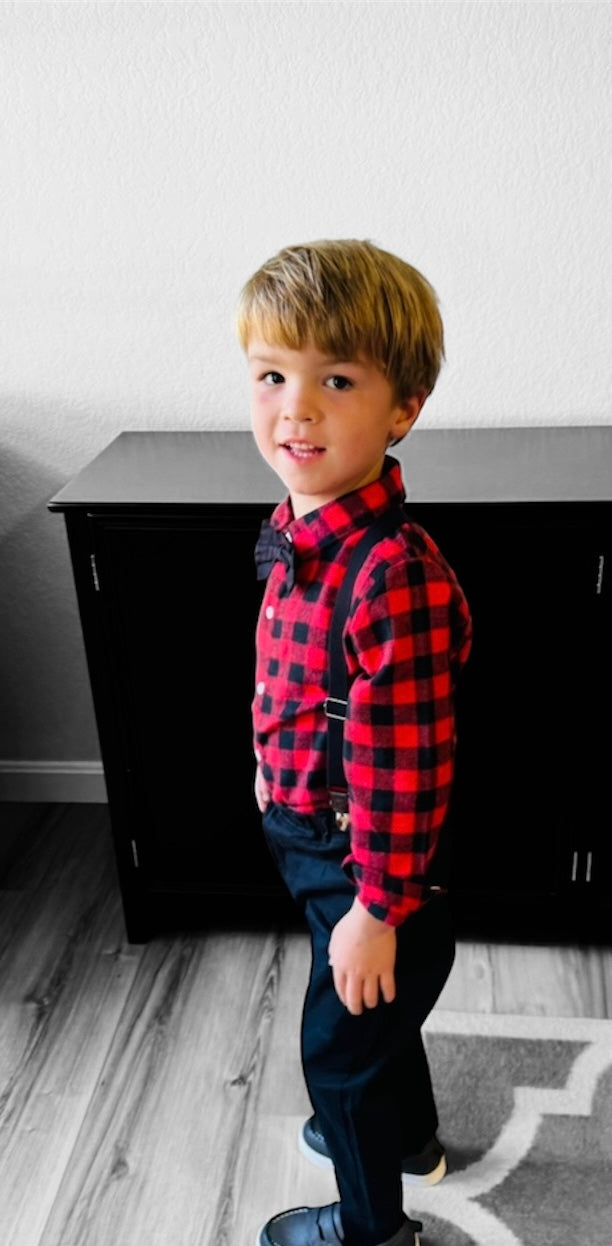 Introducing our charming toddler and boys' dress suit set with suspenders, perfect for holidays and special occasions! This dapper ensemble includes a crisp black and red checkered dress shirt, classic black trousers, a classic black bow tie, and adjustable black suspenders, creating a timeless and stylish look. The high-quality, breathable fabric ensures comfort for your little one throughout the day, while the suspenders add a fun, vintage flair. The trousers feature an elastic waistband for a snug yet comfortable fit, allowing ease of movement. Ideal for family gatherings, weddings, Christmas parties, or any event where your little gentleman wants to stand out with style and sophistication.