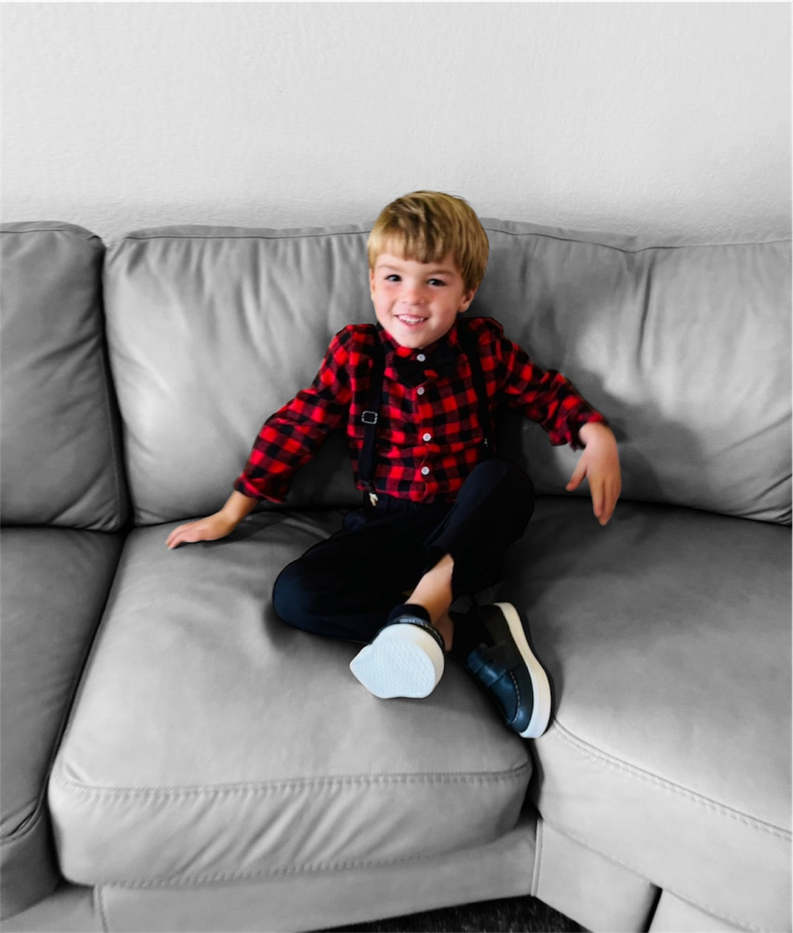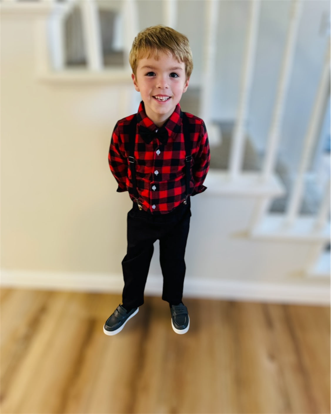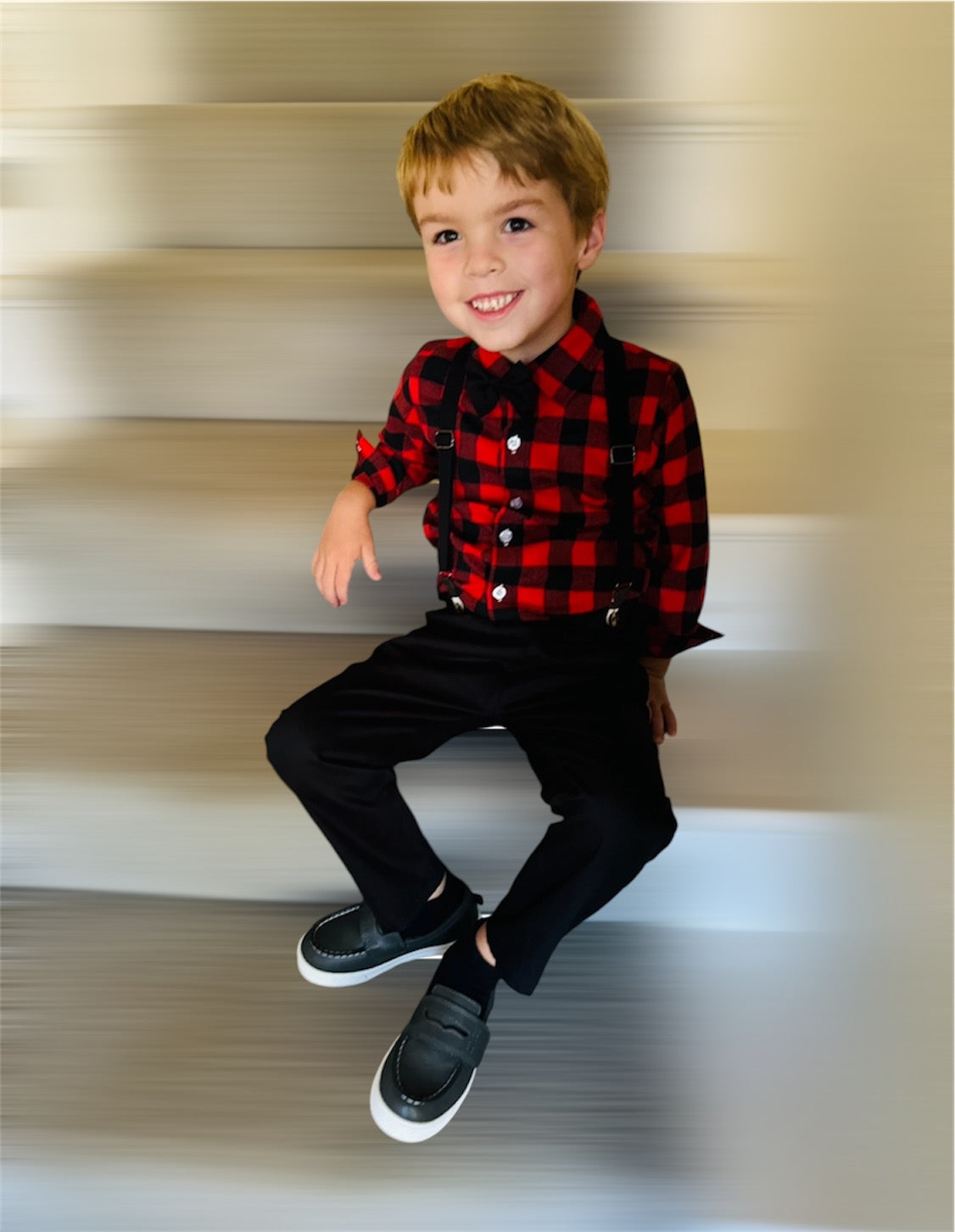 Introducing our charming toddler and boys' dress suit set with suspenders, perfect for holidays and special occasions! This dapper ensemble includes a crisp black and red checkered dress shirt, classic black trousers, a classic black bow tie, and adjustable black suspenders, creating a timeless and stylish look. The high-quality, breathable fabric ensures comfort for your little one throughout the day, while the suspenders add a fun, vintage flair. The trousers feature an elastic waistband for a snug yet comfortable fit, allowing ease of movement. Ideal for family gatherings, weddings, Christmas parties, or any event where your little gentleman wants to stand out with style and sophistication.